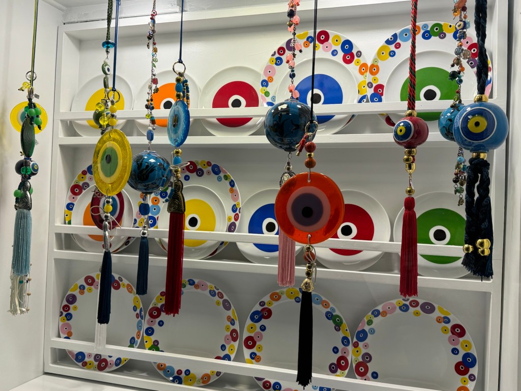 The windows are filled with handmade jewelry but also this cool decor, a bit of the traditional Greek but with in an updated vibe.