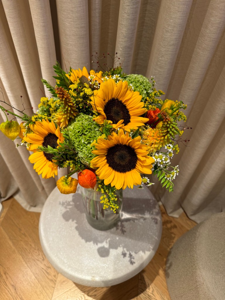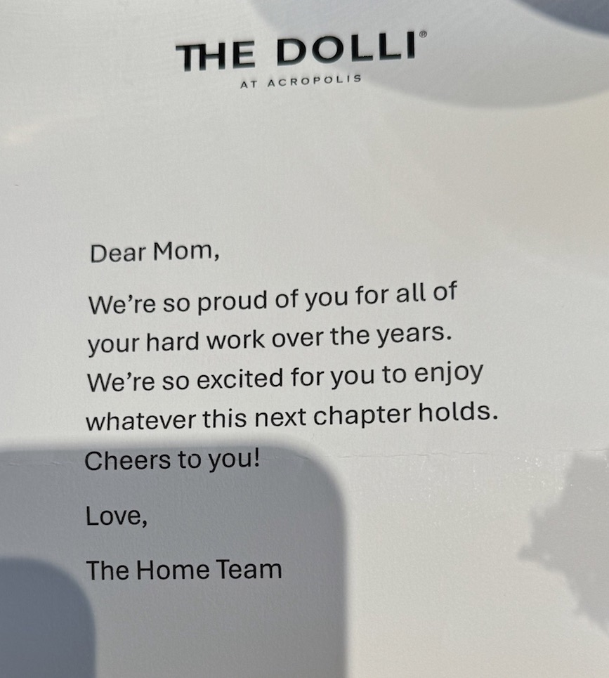 The hotel staff, gracious and beautiful, welcomes me back and tells me my room will be ready in about 10 minutes. When they escort me up to the room they tell me there is a “surprise” for me to discover. The boys have arranged room service and flowers to celebrate a safe and successful trip.