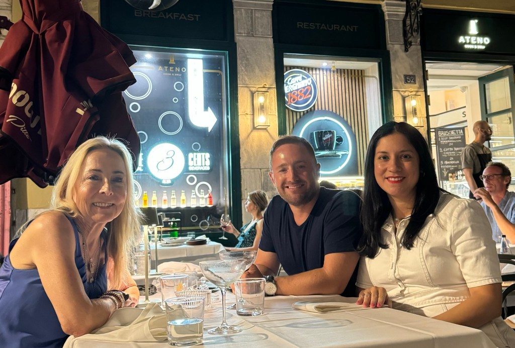 I have dinner with my dear friends. I met Nikos several years ago when traveling and he now meets me on every trip to get me to/from the airport/port/hotels. Leticia is from Paraguay, and they are a magical couple.