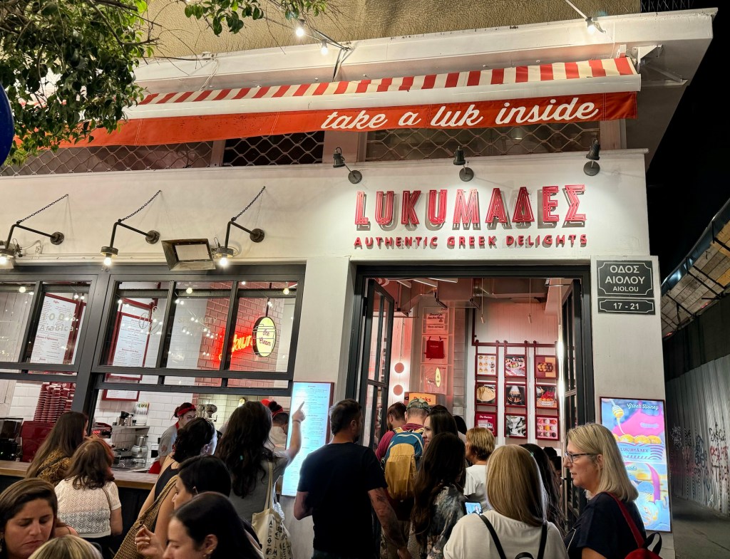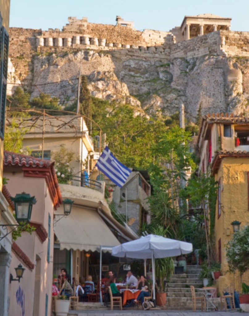 I’m here on a Sunday, a day for Athenians to walk and dine and drink. Every cafe is busy from the time I arrive in early afternoon until after dinner around 11. The streets are full and buzzing. People of all ages – couples, families from all over the world. As it gets dark the Acropolis lights up as do the streets. It is nothing short of magical.