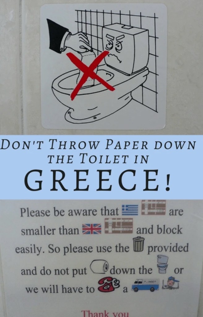 - Do not put toilet paper in the toilet. It is literally a sin or a crime or something very serious. When the hotel manager shows me my room, he reminds me of this rule and says “Welcome to Greece”