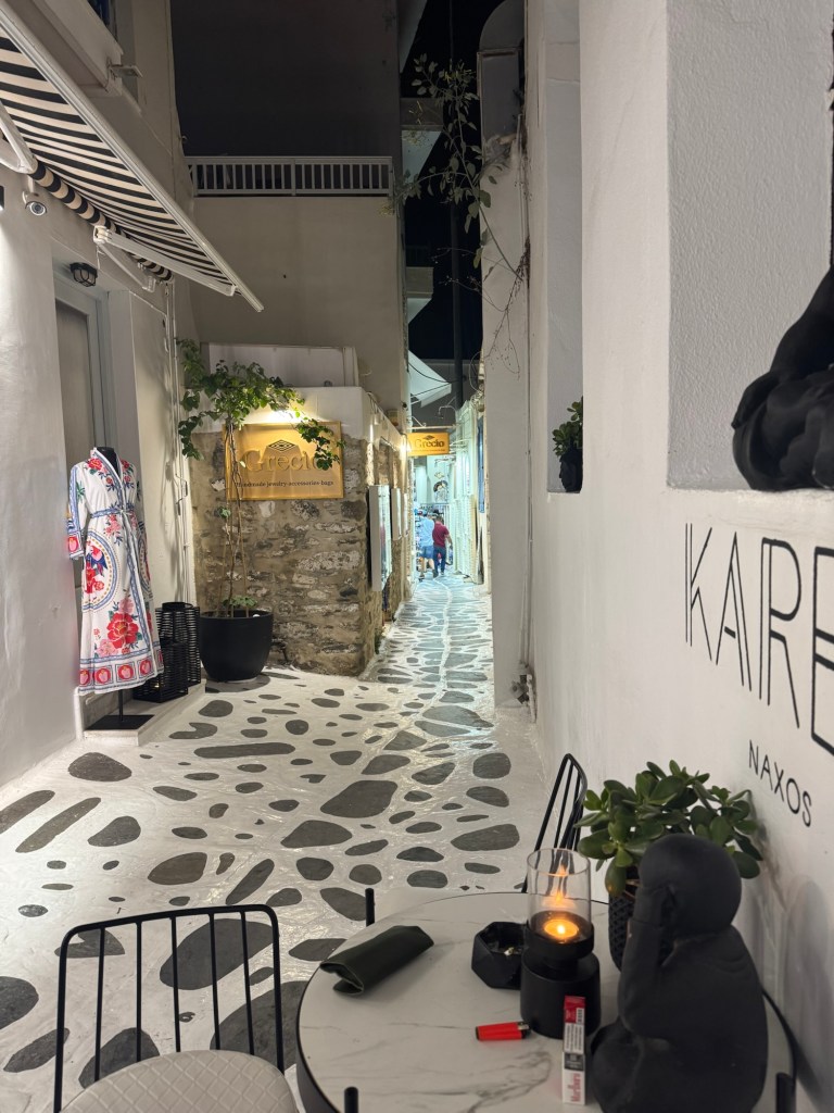 An evening stroll in town to finish the day. These Greek towns with their winding narrow streets never get old. I share an Aperol drink with a boutique owner and love the vibe.